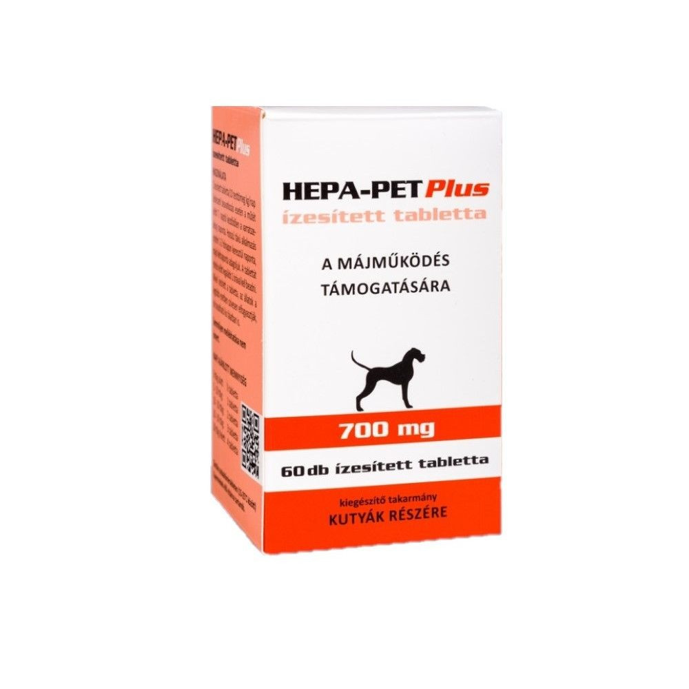 Hepa-Pet Plusz kiegészítő takarmány kutyák részére a májműködés támogatására Különösen javasolt idős állatok számáraÖsszetétel tablettánként:L-metionin /S-Adenozil-/ (SAMe) 200,00 mg Szilimarin (30% szilibinin) 100,00 mg B12-vitamin (cianokobalamin) 0,0050 mg B6-vitamin (piridoxin-hidroklorid) 12,20 mg E-vitamin (tokoferol-acetát) 5,00 mg Segédanyagok: májaroma, mikrokristályos cellulóz, karboxi-metil-cellulóz, sorbitan-trisztearát, szilikon-dioxid. Használata: 1 ízesített tabletta/10 testtömegkilogramm naponta. Sebészeti beavatkozás esetén a műtét előtti 7. naptól kezdődően a varratszedésig naponta.Hosszú távú alkalmazás esetén 1-2 hónapon keresztül naponta, majd kétnaponta adagoljuk. A tablettát etetés előtt legalább 1 órával kell beadni. Mivel ízesített a tabletta, az állatok a legtöbb esetben szívesen elfogyasztják, de beadható kis falatban is. Napi ajánlott mennyiség:10 ttkg alatt: 1/2-1 tabletta 10-20 ttkg: 2 tabletta 20-30 ttkg: 3 tabletta 30 ttkg felett: 4 tabletta