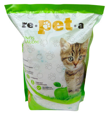 Kiváló minőségű macskaalom, kellemes zöldalma illattal. Előnyök: - Egy zacskó Repeta szilikonos macskaalom több mint egy hónapig elegendő - Teljesen szagtalan marad használat közben is, mivel semlegesíti a kellemetlen szagokat - 100 %-ig környezetbarát, nem mérgező - A speciális, szögletes forma megakadályozza a szemek szétszóródását - Kristály szerkezete miatt nem tapad fel az állat szőrére - Ez a pormentes és antiallergén macskaalom nem irritálja sem az Ön, sem a kedvence szemét és orrát - A szilikon kristályok tökéletesen megkötik a nedvességet, szárazon tartva ezzel az almot Használati tanácsok: - Az alomtálcát kb. 3-4 cm vastagon töltse fel a Repeta szilikonos macskaalommal - A legelső használatkor fontos, hogy az állat megszokja az új almot, ezért ajánlatos összekeverni a régivel - Alomlapáttal a darabos ürüléket rendszeresen távolítsa el, és az almot bizonyos időközönként teljes egészében forgassa át! - A kristályok hatékonysága nem csökken elszíneződés esetén sem - Ajánlatos a tálcát száraz, meleg helyre tenni, mert ez nagyban megnöveli a szilikon nedvszívó képességét - Az elhasznált kristályokat nyugodtan el lehet ásni, mert 100 %-ig lebomlanak, de ajánlatos a fáktól, növényektől legalább 1 - 1,5 m távolságot tartani - Ha az almot több állat is használja mindenképpen ajánlatos gyakrabban cserélni
