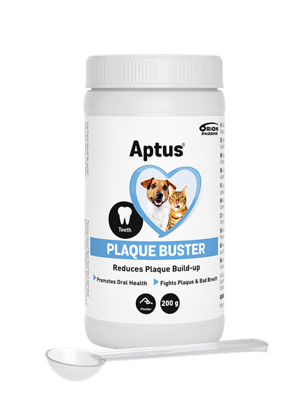 Fogápolószer kutyák és macskák számára foglepedék képződésének megakadályozására.Foglepedék hatása a fogakra és a fogínyre:- Rossz lehelet- Egész egészségre következménnyel van- FoglazulásJellemzők:- 100%-ban természetes tengeri moszatból készült liszt (Ascophyllum nodosum).- A lepedék-és fogkőképződés csökkentésére, következményesen javítja a szájszagot.- Könnyen hozzáadható kedvence főételéhez.Ajánlott napi adagolás:1/3 mérőkanál -1 mérőkanál - 10-25 kg2 mérőkanál - >25 kgAdjon Aptus Plaque Buster-t naponta a főétkezéssel egyidőben és keverje össze az étellel.Tisztább fogakat és jobb leheletet 1-2 hónapon belül várhat.A rendszeres napi fogápolás jó egészséget és higiéniát tart fenn a szájban.Összetétel:100%-ban természetes tengeri moszatból készült liszt (Ascophyllum nodosum)Figyelmeztetés:A tengeri moszat természetesen magas jódtartalma miatt nem ajánljuk a pajzsmirigyproblémával küzdő társállatoknak.