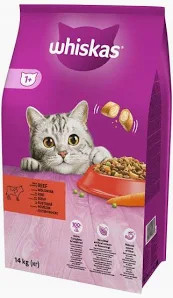 A Whiskas szárazeledel marhával étrendileg teljes értékű és kiegyensúlyozott táplálék a felnőtt macskák számára.