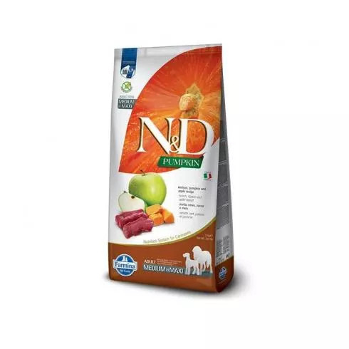 N&D Sütőtökkel - Szarvas, sütőtök és alma receptúra.Teljes értékű száraz eledel, közepes és nagytestű felnőtt kutyák részére.ÖSSZETEVŐKszarvas (22%), dehidratált szarvasfehérje (20%), édesburgonya, csirkezsír, szárított sütőtök (5%), szárított tojás, hering, dehidratált heringfehérje, halolaj (heringből), borsórost, szárított sárgarépa, lucernaliszt, inulin, frukto-oligoszacharidok, élesztő kivonat (manno-oligoszacharidok forrása), szárított alma (0,5%), szárított gránátalma, szárított spenót, útifűmaghéj, szárított édesnarancs, szárított áfonya, nátrium-klorid, szárított sörélesztő, kurkuma (0,2%), aloe vera kivonat, glükozamin, kondroitin-szulfát.ADALÉKANYAGOK KILOGRAMMONKÉNTTápértékkel rendelkező adalékanyagok: A-vitamin 15000NE; D3-vitamin 1500NE; E-vitamin 600mg; C-vitamin 150mg; niacin 37,5mg; kalcium-D-pantotenát 15mg; B2-vitamin 7,5mg; B6-vitamin 6mg; B1-vitamin 4,5mg; biotin 0,38mg; folsav 0,45mg; B12-vitamin 0,1mg; kolin-klorid 2500mg; béta-karotin 1,5mg; Cink (metionin-hidroxi-analóg cinkkelátja): 163,8mg; Mangan (metionin-hidroxi-analóg mangánkelátja): 64,6mg; Vas (glicin-hidrát vas (II)-kelátja): 58,3mg; Réz (metionin-hidroxi-analóg rézkelátja): 15,8mg; Szelén (szeléntartalmú inaktivált élesztő): 0,00088mg; DL-metionin ipari tisztaságú 4000mg; taurin 1000mg; L-karnitin 300mg. Érzékszervi tulajdonságokat javító adalékanyagok: zöldtea kivonat 100mg; rozmaring kivonat. Antioxidánsok: növényi olajokból származó tokoferol kivonatok.ANALITIKAI ÖSSZETEVŐKnyersfehérje 28,00%; nyerszsír 18,00%; nyersrost 2,90%; nedvesség 9,00%; nyershamu 8,60%; kalcium 1,10%; foszfor 0,80%; Omega-6 3,30%; Omega-3 0,90%; DHA 0,50%; EPA 0,30%; glükozamin 1200mg/kg; kondroitin-szulfát 900mg/kg.ENERGIA ÉRTÉKEM Kcal/Kg 3926 - Mj/Kg 16,42